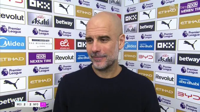 虎扑03月05日讯 曼城主教练瓜迪奥拉在2-2战平诺丁汉森林的赛后,接受TNT Sport采访。