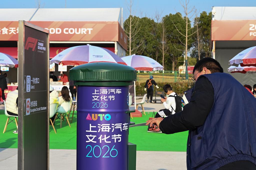 2026年3月13日,上海汽车文化节,一位游客将赛车主题的明信片投到邮筒里。